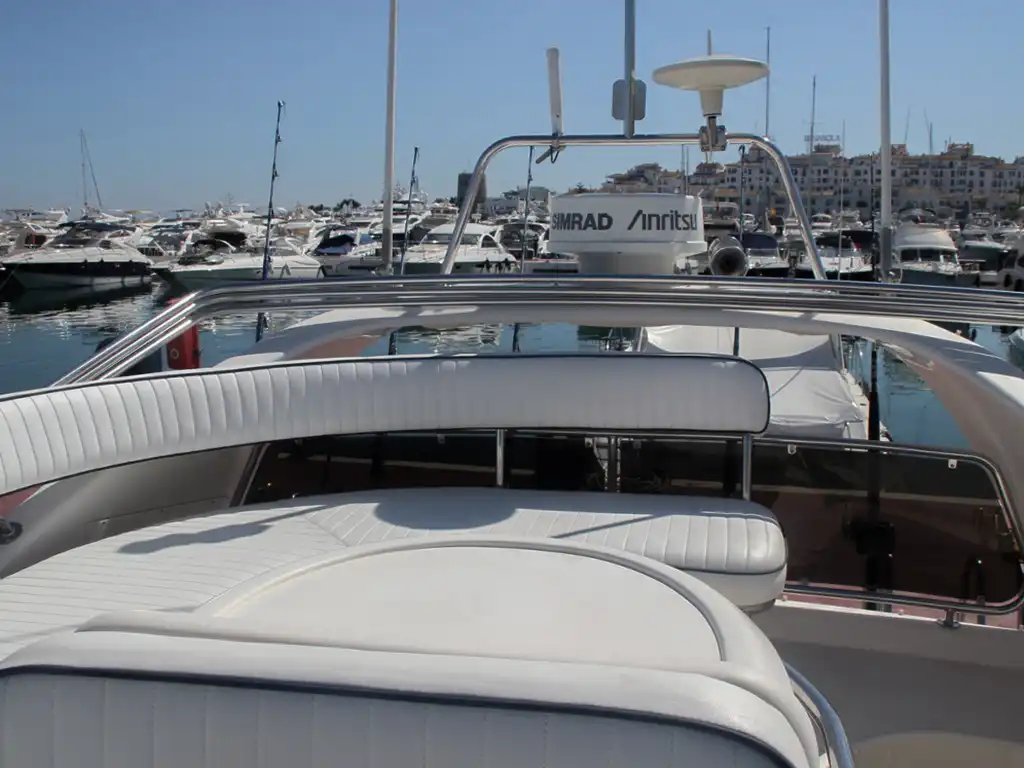 Su parte superior (flybridge) es acojedora y confortable para disfrutar de las hermosas vistas de Marbella, está cubierto de un toldo. Si desean Sol, pueden acceder a la proa y tumbarse en las colchonetas.