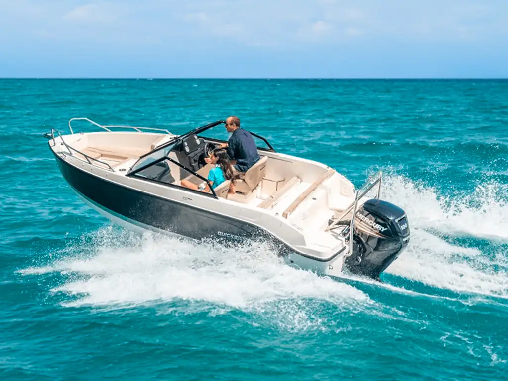 alquila esta magnifica Quicksilver, ideal para navegar en familia por los Acantilados de Maro y hacer deportes acuáticos.