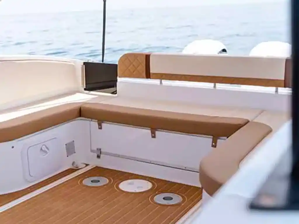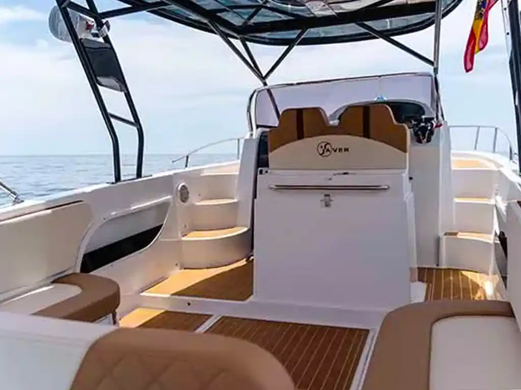 Destaca por su amplitud y distribución: ofrece mucho espacio a bordo, con asientos muy cómodos tanto en proa como en popa, y un gran solárium perfecto para tomar el sol. El techo proporciona amplia sombra y protección durante las horas más calurosas del día.