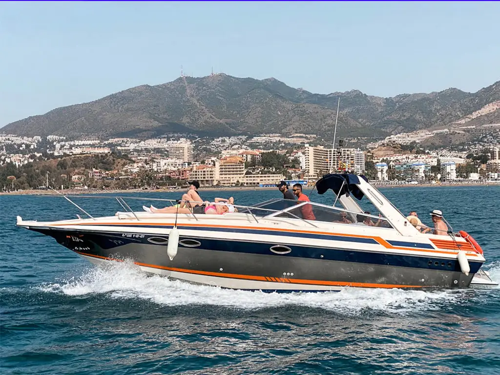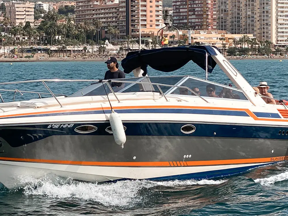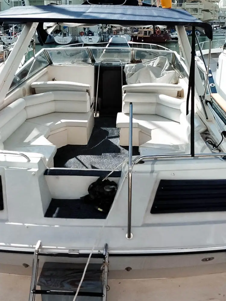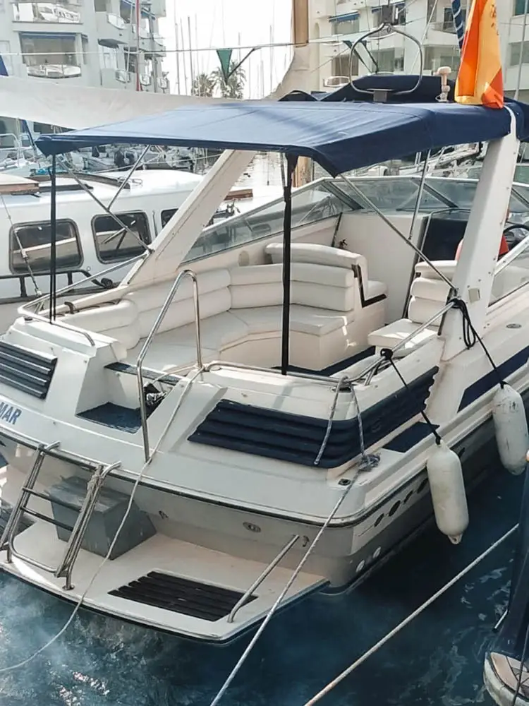 Este espacioso y potente barco a motor es barco modelo Sunseeker portofino 31, y cuenta con todas las comodidades de los barcos de alquiler (baño eléctrico, nevera eléctrica, toldo bimini en la popa para la sombra, colchonetas en proa para tomar el sol, plataforma de baño, étc).