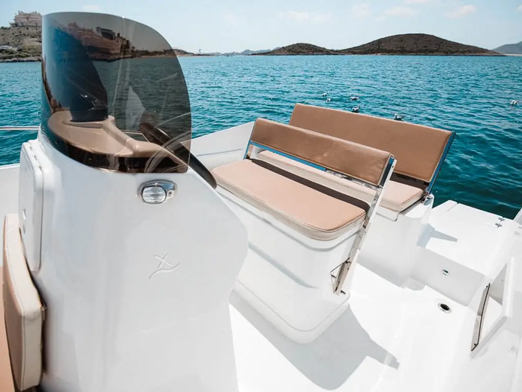 El barco cuenta con unas colchonetas espaciosas para tomar el sol en la proa, toldo Bimini, y altavoces integrados.