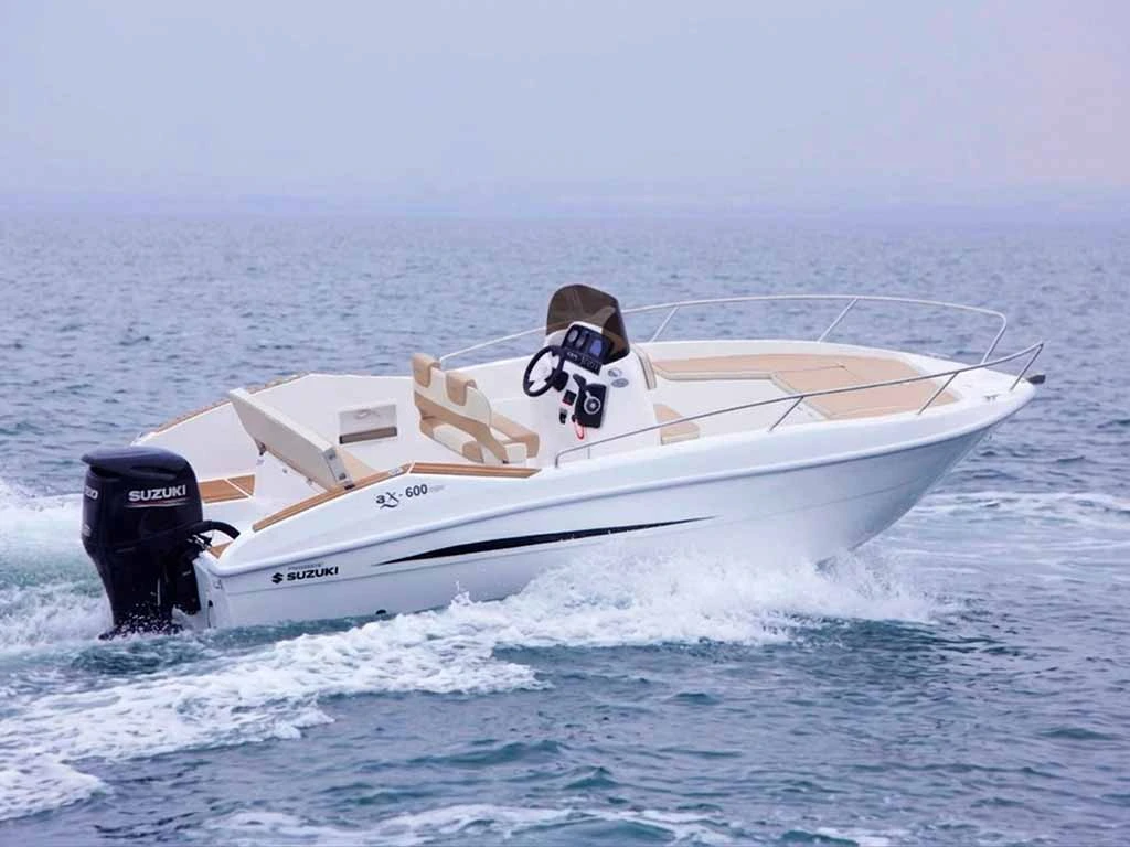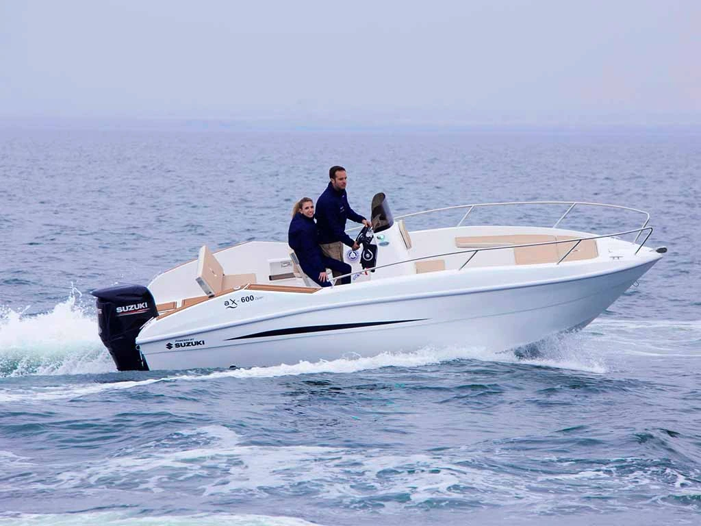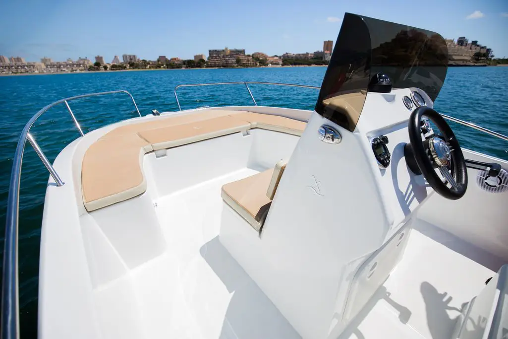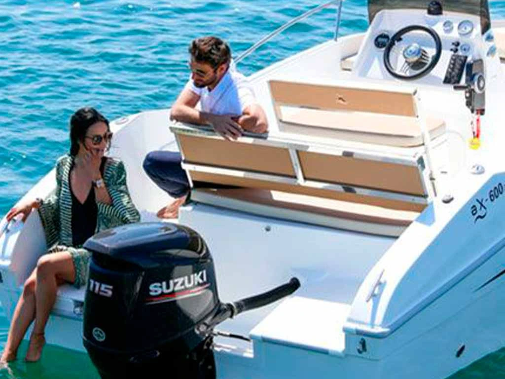 Este barco de alquiler en Benalmádena es un Astillux 600, con un motor fueraborda de 115CV. Mide 6 metros de eslora, por lo que se puede manejar por libre con la licencia de navegación, y tiene una capacidad para grupos de hasta 8 personas (7 pasajeros + patrón).