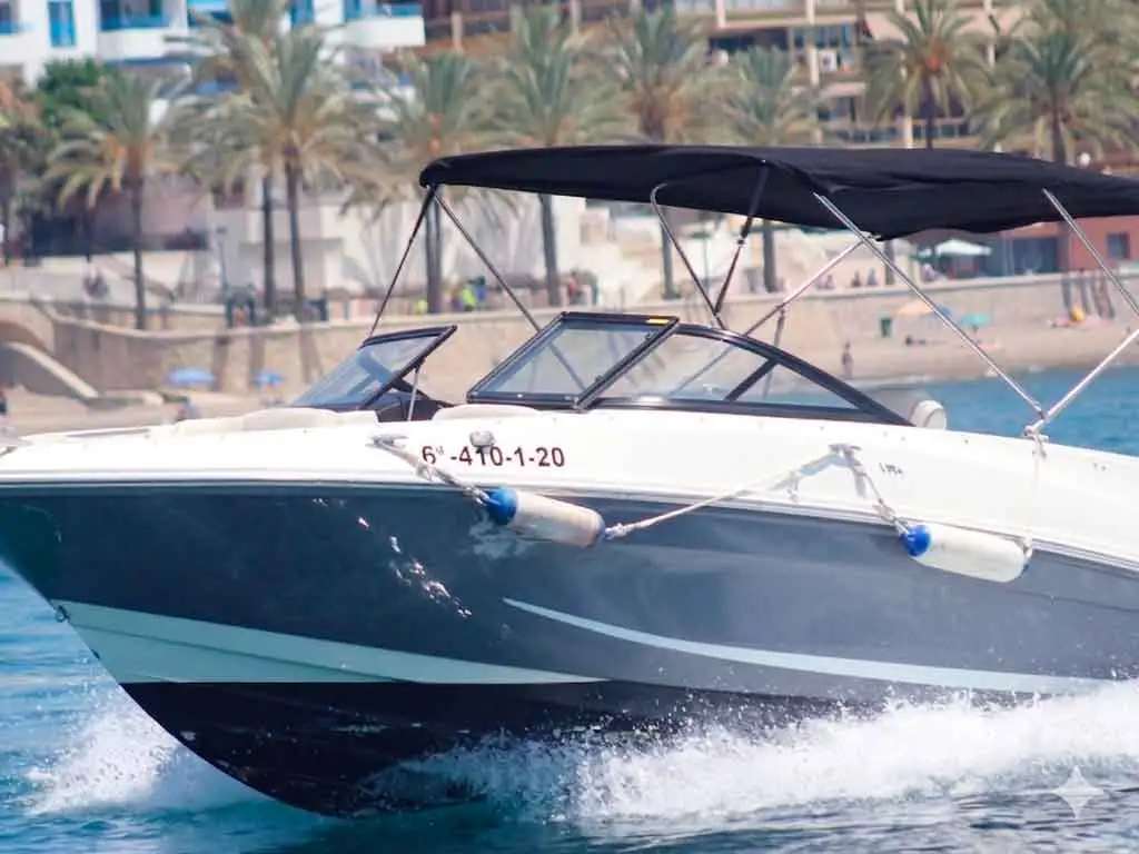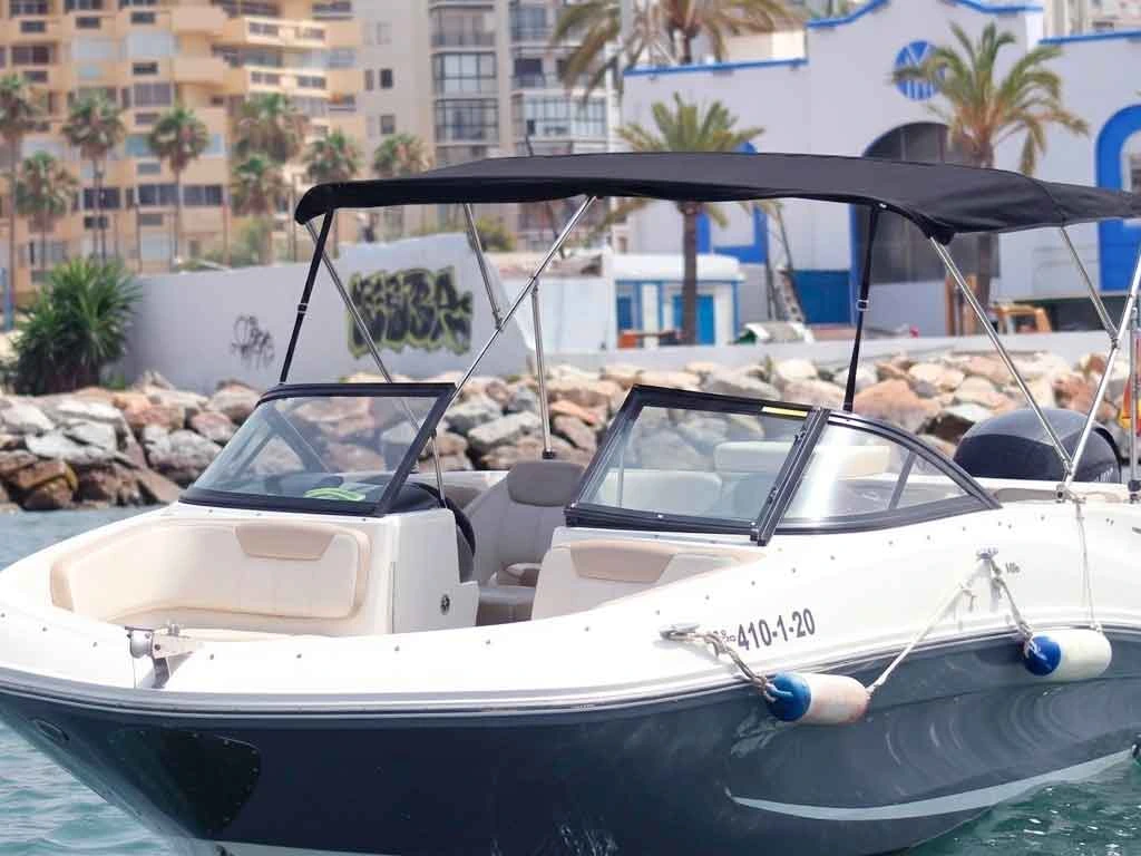 Uno de los barcos a motor para alquilar con licencia de navegación que están disponibles en Málaga es esta BAYLINER VR5, con capacidad para grupos de hasta 7 personas, y motor fueraborda de 150CV.