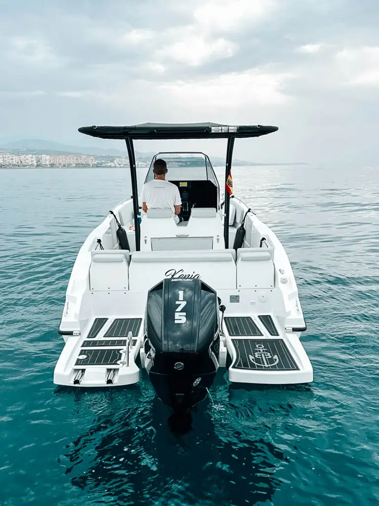 Esta lancha dispone de altavoces conectados a radio bluetooth, proa abierta con colchonetas, toldo bimini, espaciosa plataforma de baño, étc.