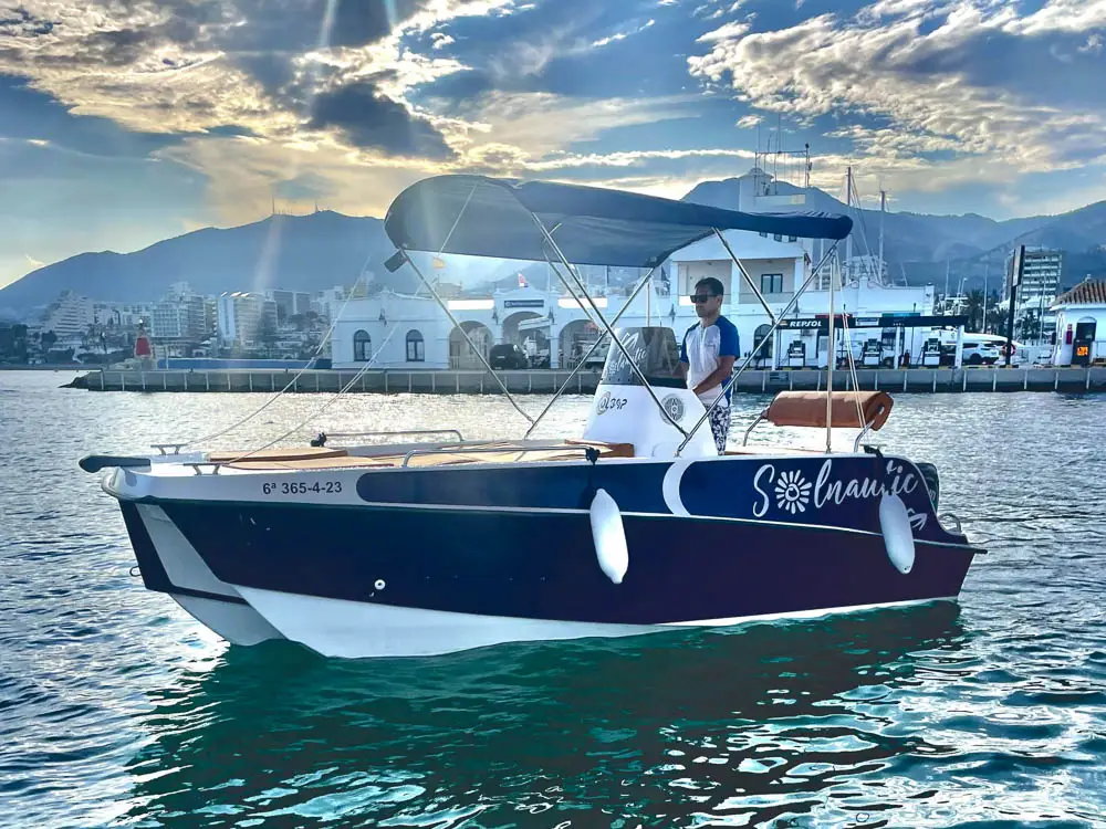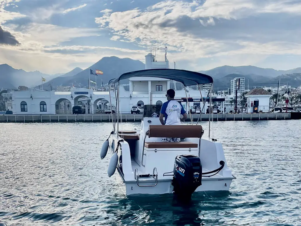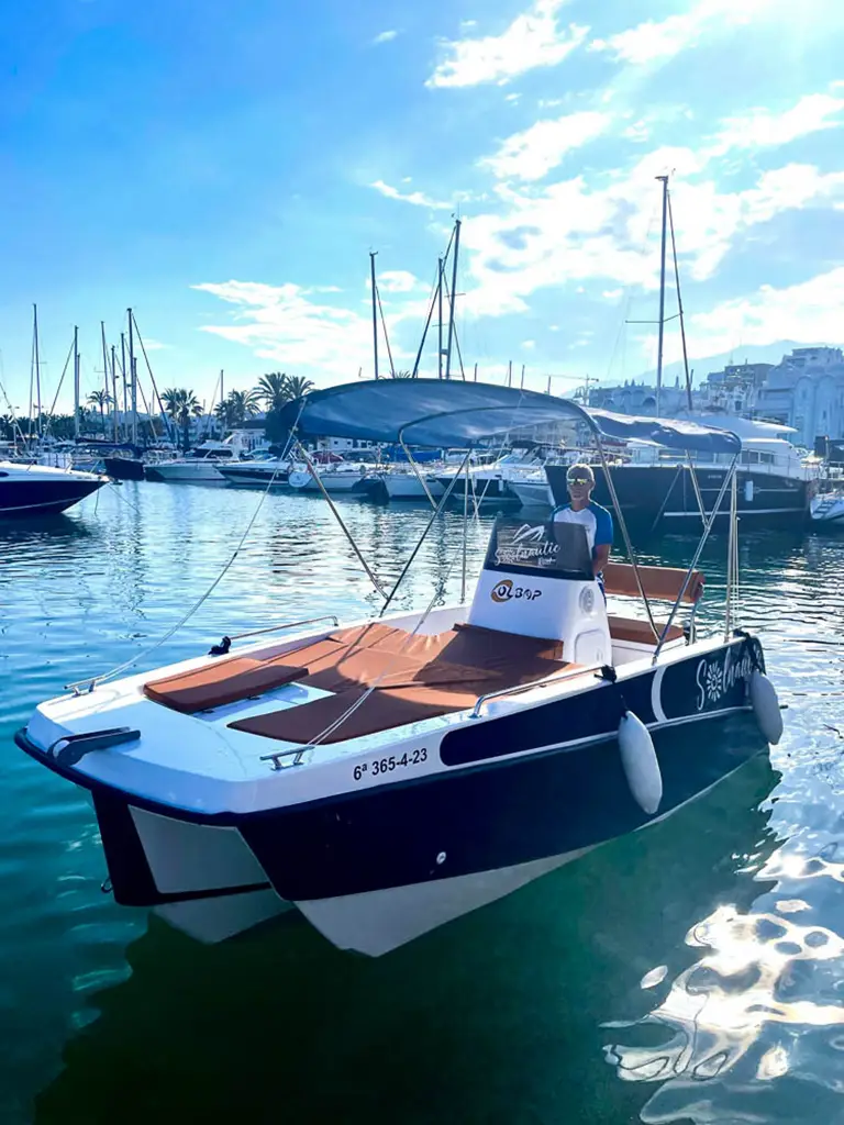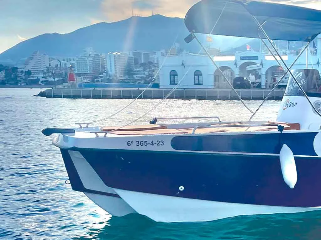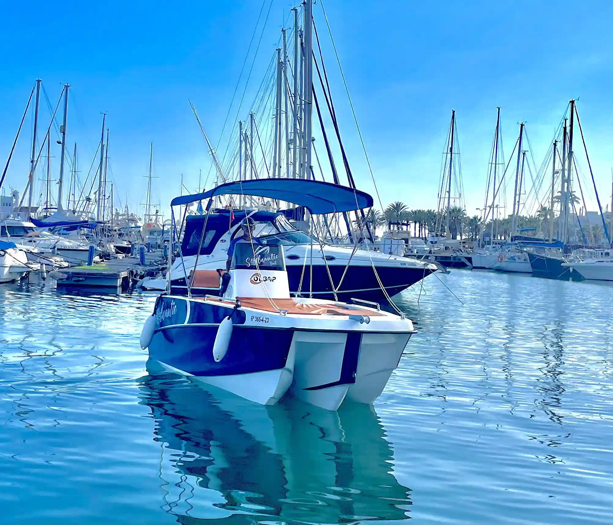 Este bonito y espacioso barco sin licencia Olbap es un trimarán, y tiene una eslora de 5 metros y una capacidad para grupos de hasta 6 personas. Tiene unas amplias colchonetas en proa para tomar el sol y es un barco ideal para dar pequeños paseos por la costa.