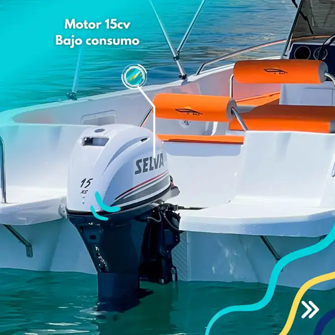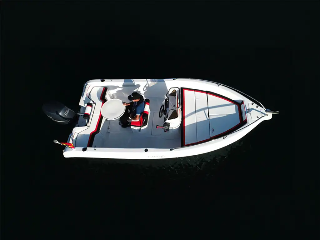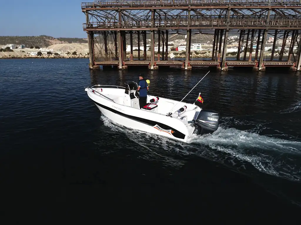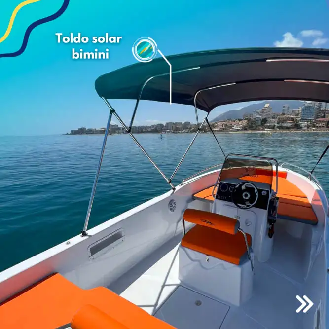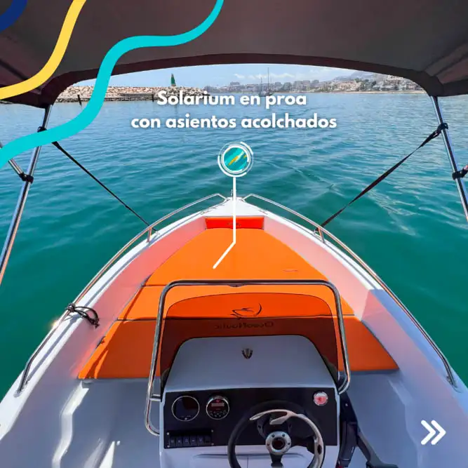 Tiene un motor de 15Cv con muy bajo consumo y es perfecto para dar pequeños paseos por la costa. Podrás alquilarlo por libre y subir hasta 6 personas a bordo para disfrutar de la navegación y el buen tiempo en la costa de Benalmádena. El barco tiene toldo para el sol, colchonetas en la proa para tumbarse y plataforma de baño, así como altavoces bluetooth.