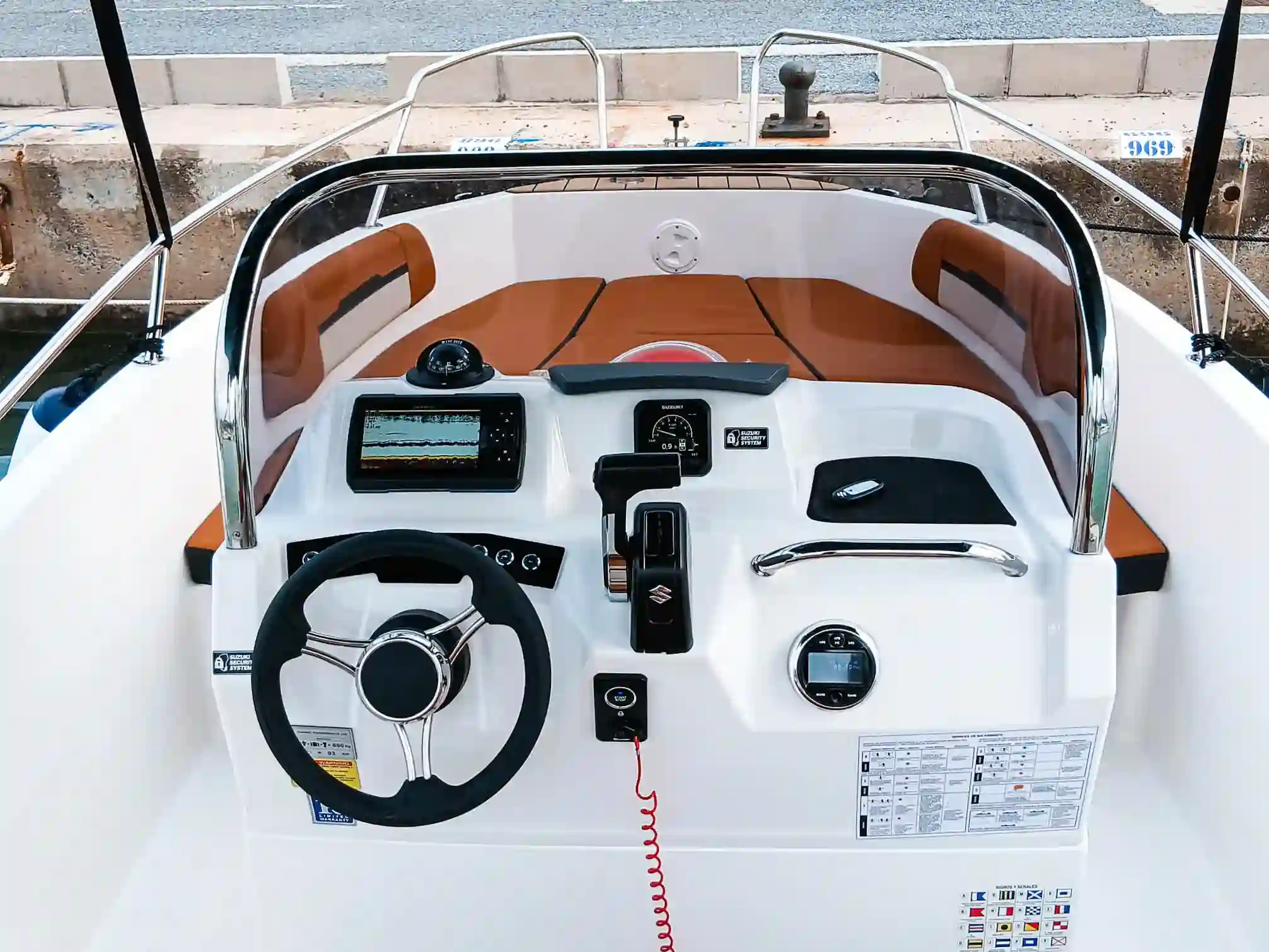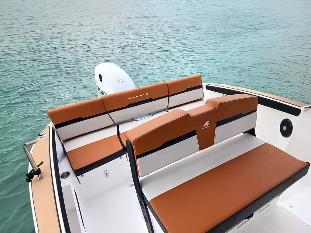 Esta potente lancha Karnic con 115CV, es uno de los barcos a motor para alquilar con licencia de navegación disponibles en Málaga. Tiene capacidad para 7 personas + patrón.