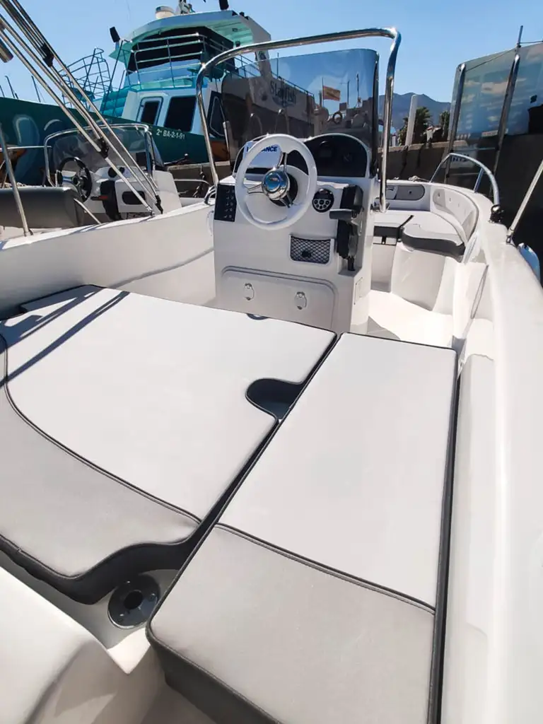 Su diseño amplio y cómodo lo hace perfecto para pasar un día completo navegando por la costa, fondear en calas tranquilas o simplemente relajarse bajo el sol. En la proa cuenta con un solárium acolchado, ideal para tomar el sol, y un toldo bimini que proporciona sombra cuando más se necesita. Dispone también de escalera de baño, ancla y radio Bluetooth, para crear el ambiente perfecto a bordo.