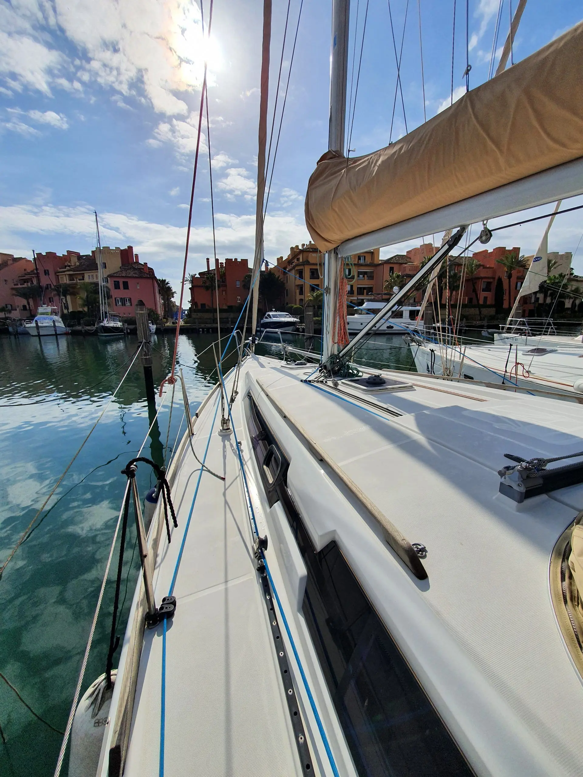 Este velero Dufour 37 Grand Large se encuentra en el puerto deportivo de Sotogrande, en el límite de las provincias de Cádiz y Málaga..