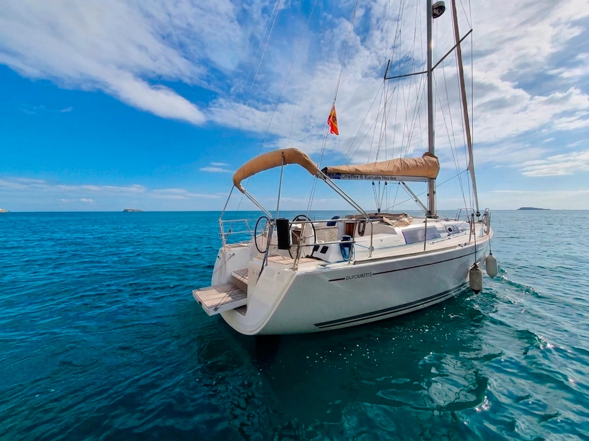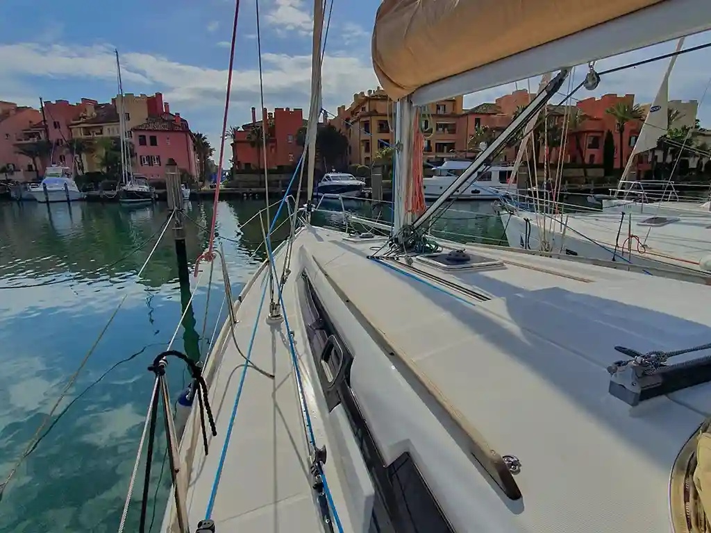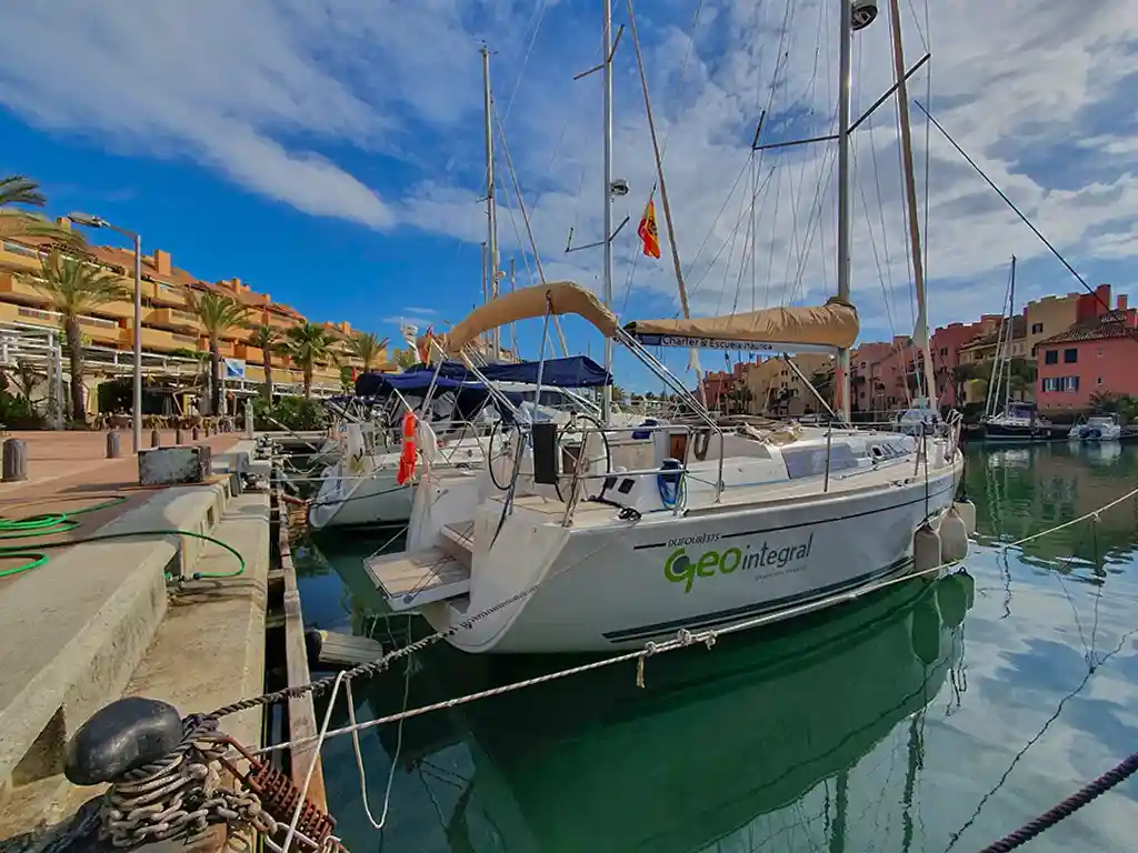 Este velero Dufour 37 Grand Large se encuentra en el puerto deportivo de Sotogrande, en el límite de las provincias de Cádiz y Málaga..