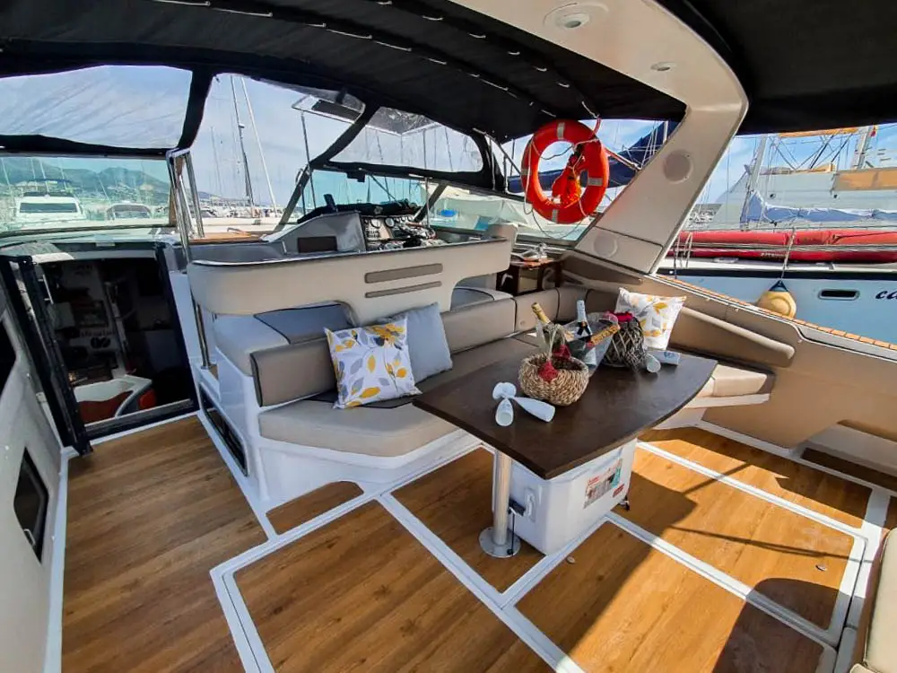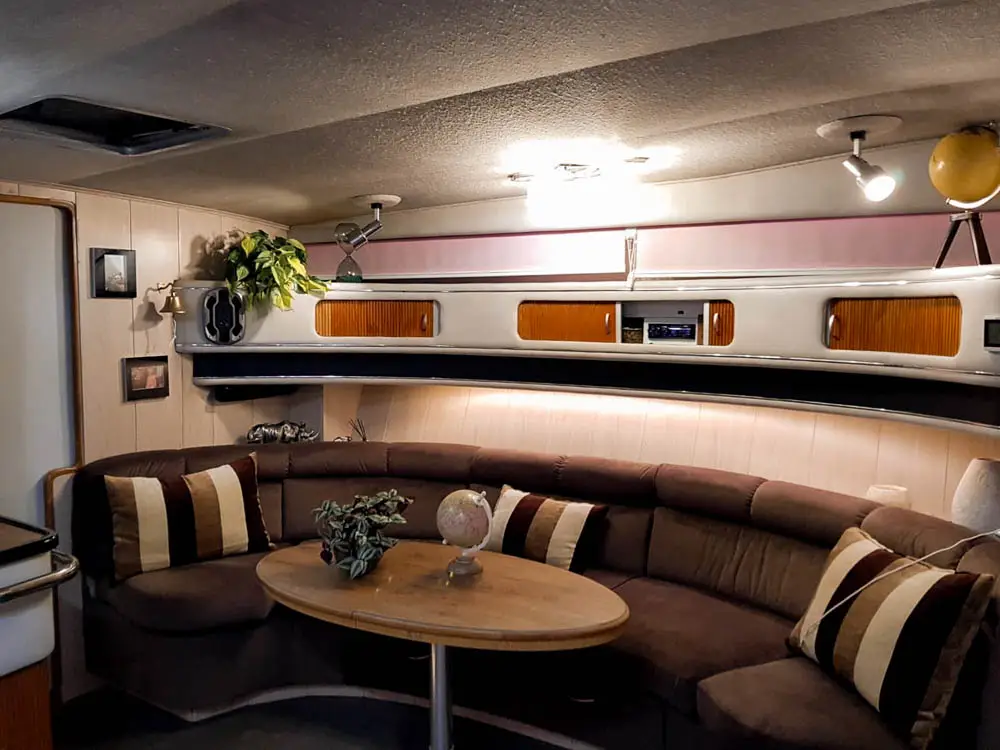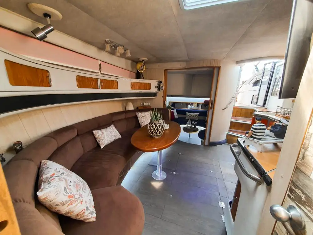Este barco dispone de dos camarotes dobles, un baño y un salón con sofás y altamente equipado para que tengas todas las comodidades.