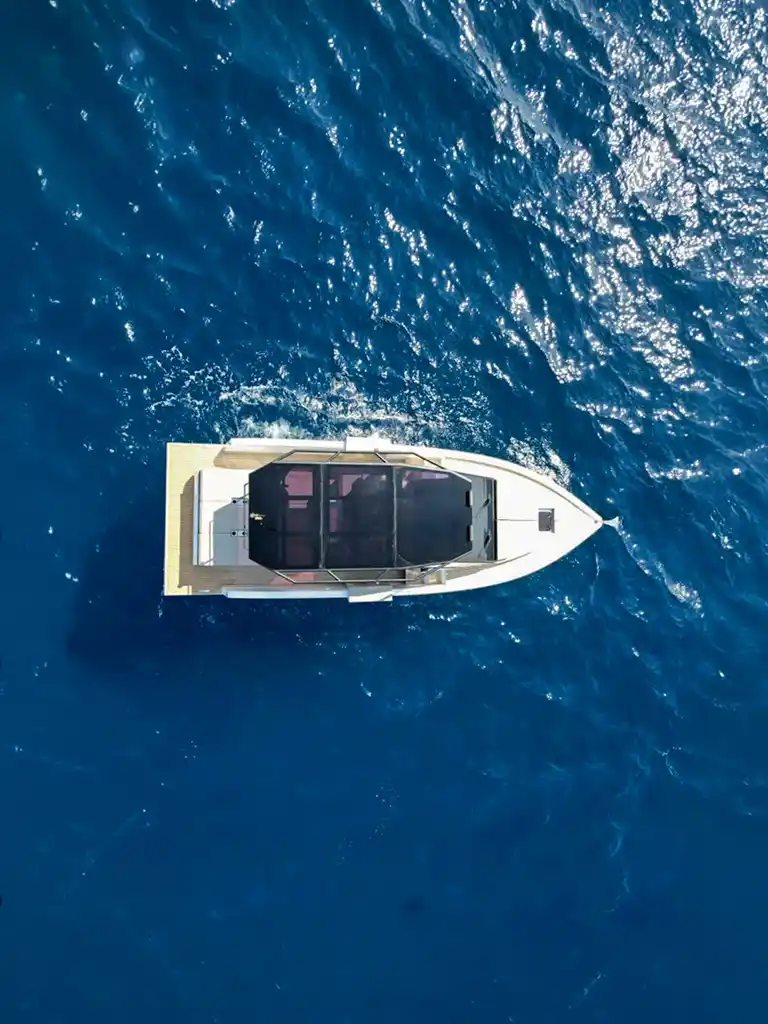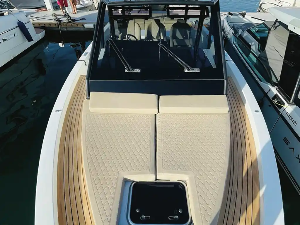 Se trata de un barco muy lujoso y moderno, con colchonetas para tumbarse y tomar el sol tanto en la popa como en la proa. Cuenta con un gran espacio de sombra en la bañera, así como un gran espacio interior.