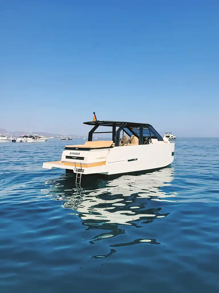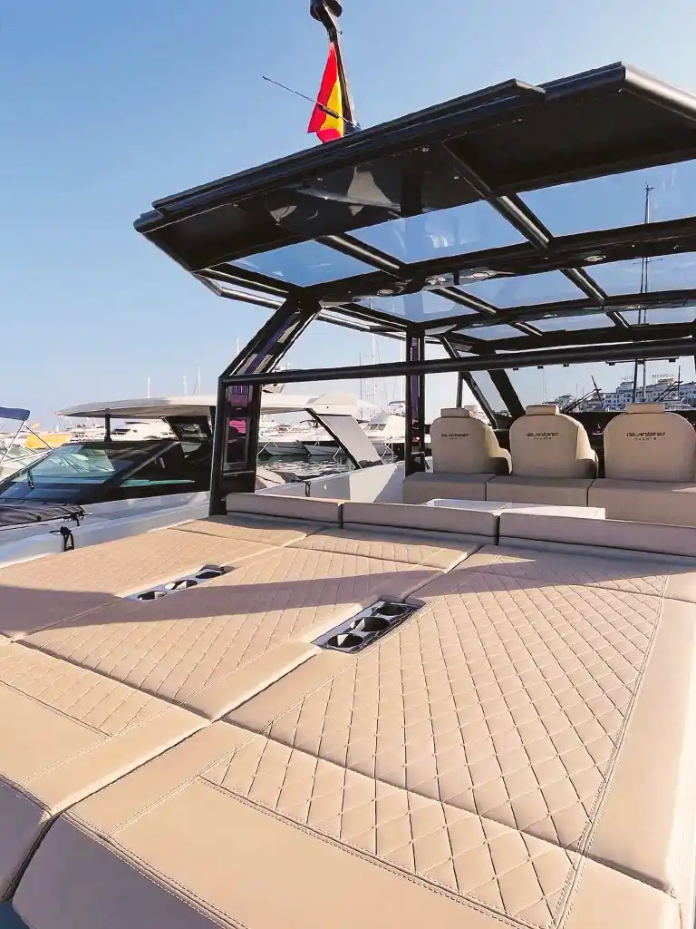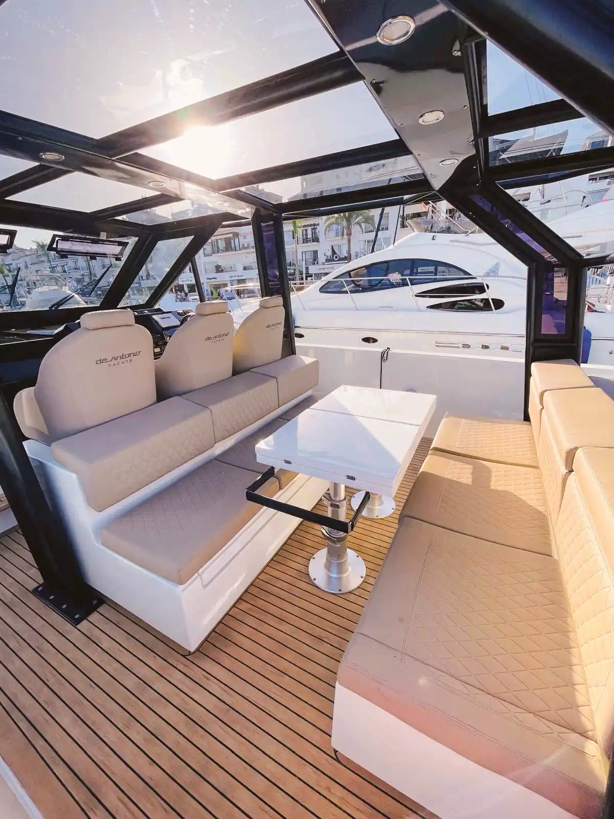 Este moderno yate del astillero De Antonio Yachts cuenta con un gran espacio para hasta 12 pasajeros, y se encuentra atracado en el puerto de Puerto Banús, en Marbella.