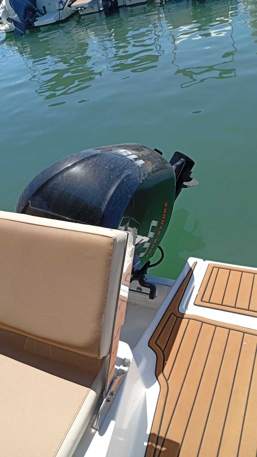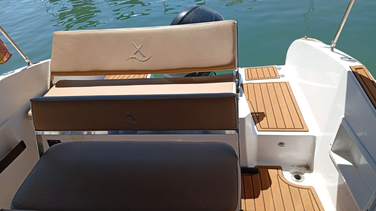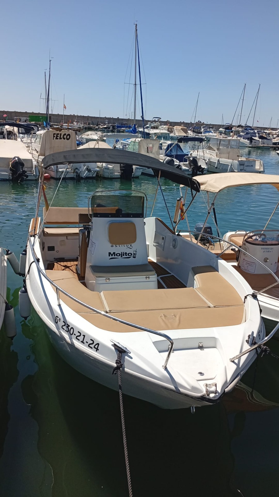 Este barco de alquiler en Benalmádena es un Astillux 600, con un motor fueraborda de 115CV. Mide 6 metros de eslora, por lo que se puede manejar por libre con la licencia de navegación, y tiene una capacidad para grupos de hasta 8 personas (7 pasajeros + patrón).