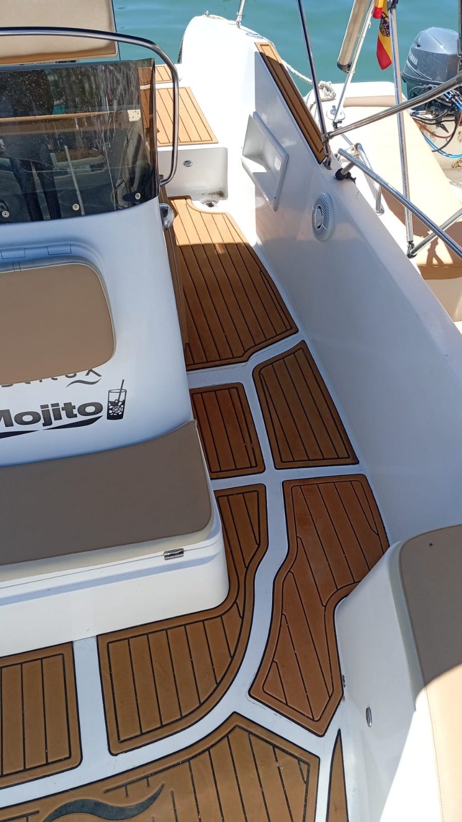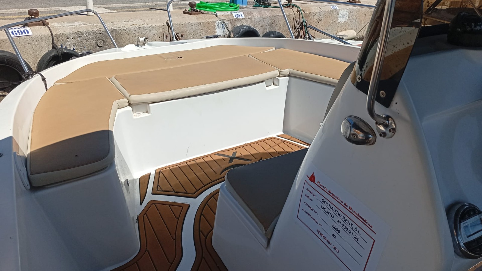 El barco cuenta con unas colchonetas espaciosas para tomar el sol en la proa, toldo Bimini, y altavoces integrados.