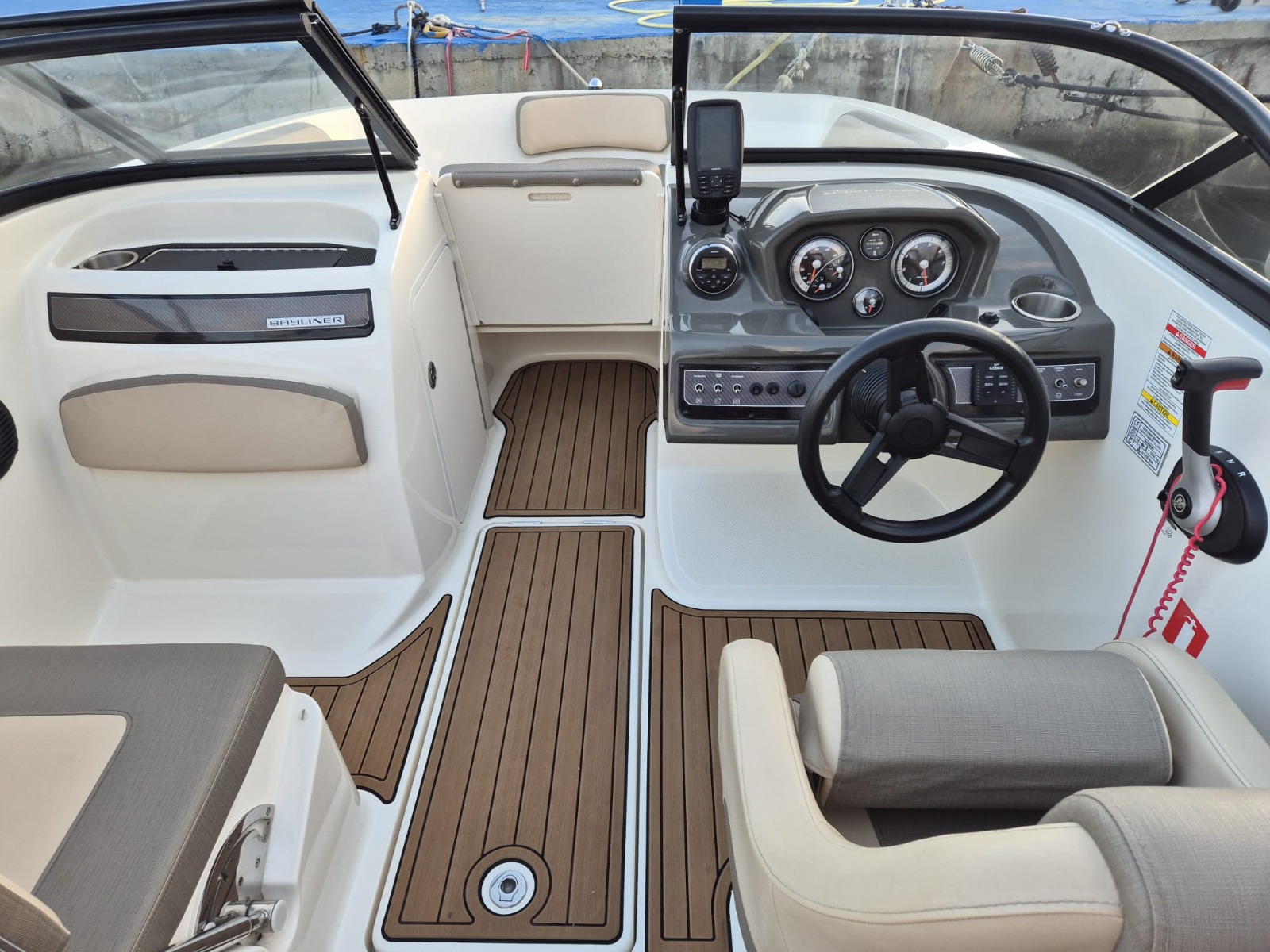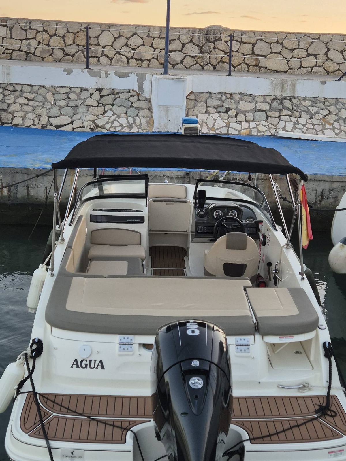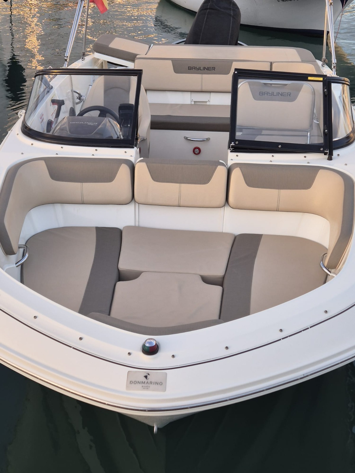 Uno de los barcos a motor para alquilar con licencia de navegación que están disponibles en Málaga es esta BAYLINER VR5, con capacidad para grupos de hasta 7 personas, y motor fueraborda de 150CV.