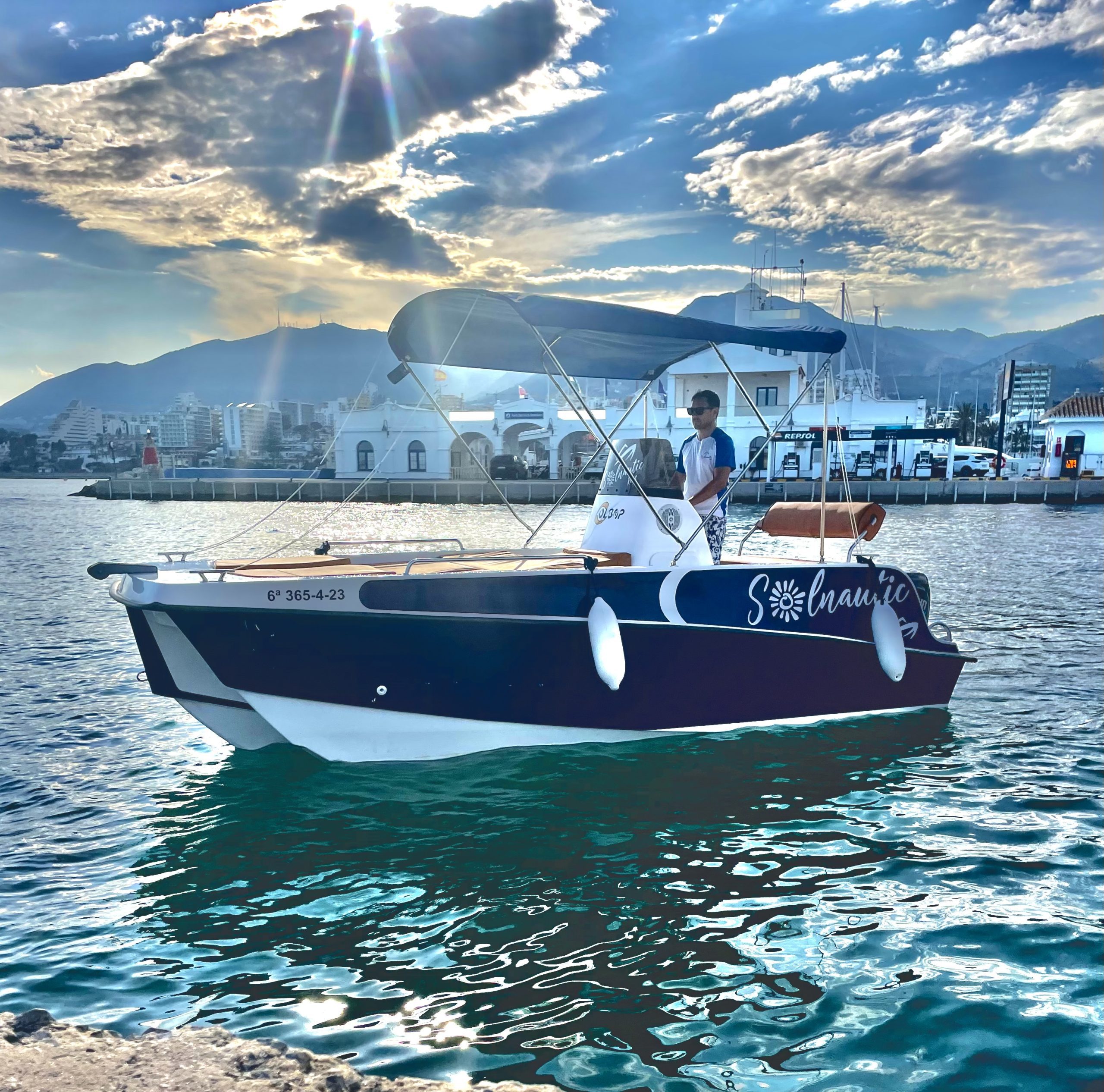 Este bonito y espacioso barco sin licencia Olbap es un trimarán, y tiene una eslora de 5 metros y una capacidad para grupos de hasta 6 personas. Tiene unas amplias colchonetas en proa para tomar el sol y es un barco ideal para dar pequeños paseos por la costa.