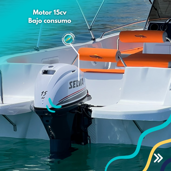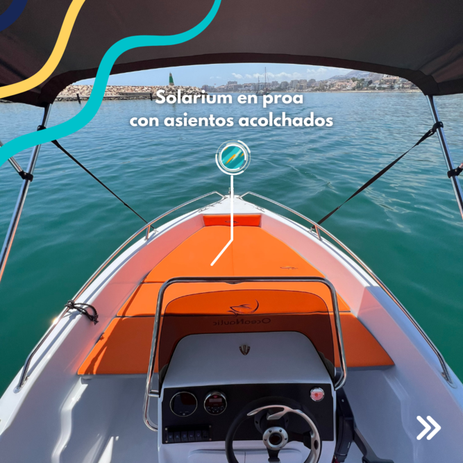 Tiene un motor de 15Cv con muy bajo consumo y es perfecto para dar pequeños paseos por la costa. Podrás alquilarlo por libre y subir hasta 6 personas a bordo para disfrutar de la navegación y el buen tiempo en la costa de Benalmádena. El barco tiene toldo para el sol, colchonetas en la proa para tumbarse y plataforma de baño, así como altavoces bluetooth.