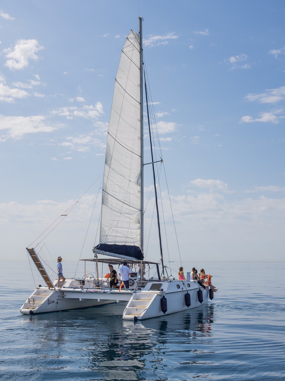 Este espacioso catamarán se encuentra en el puerto deportivo de Benalmádena y tiene capacidad máxima para grupos de hasta 12 pasajeros. Cuenta con todas las comodidades para pasar un estupendo día de sol y mar, tiene altavoces exteriores que se pueden conectar por bluetooth, zona de sombra en la popa, y zona de colchonetas para tomar el sol en la proa, neveras, baño, étc.