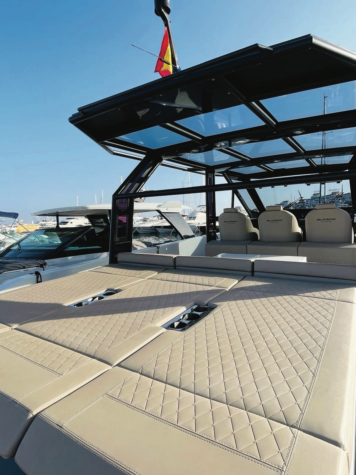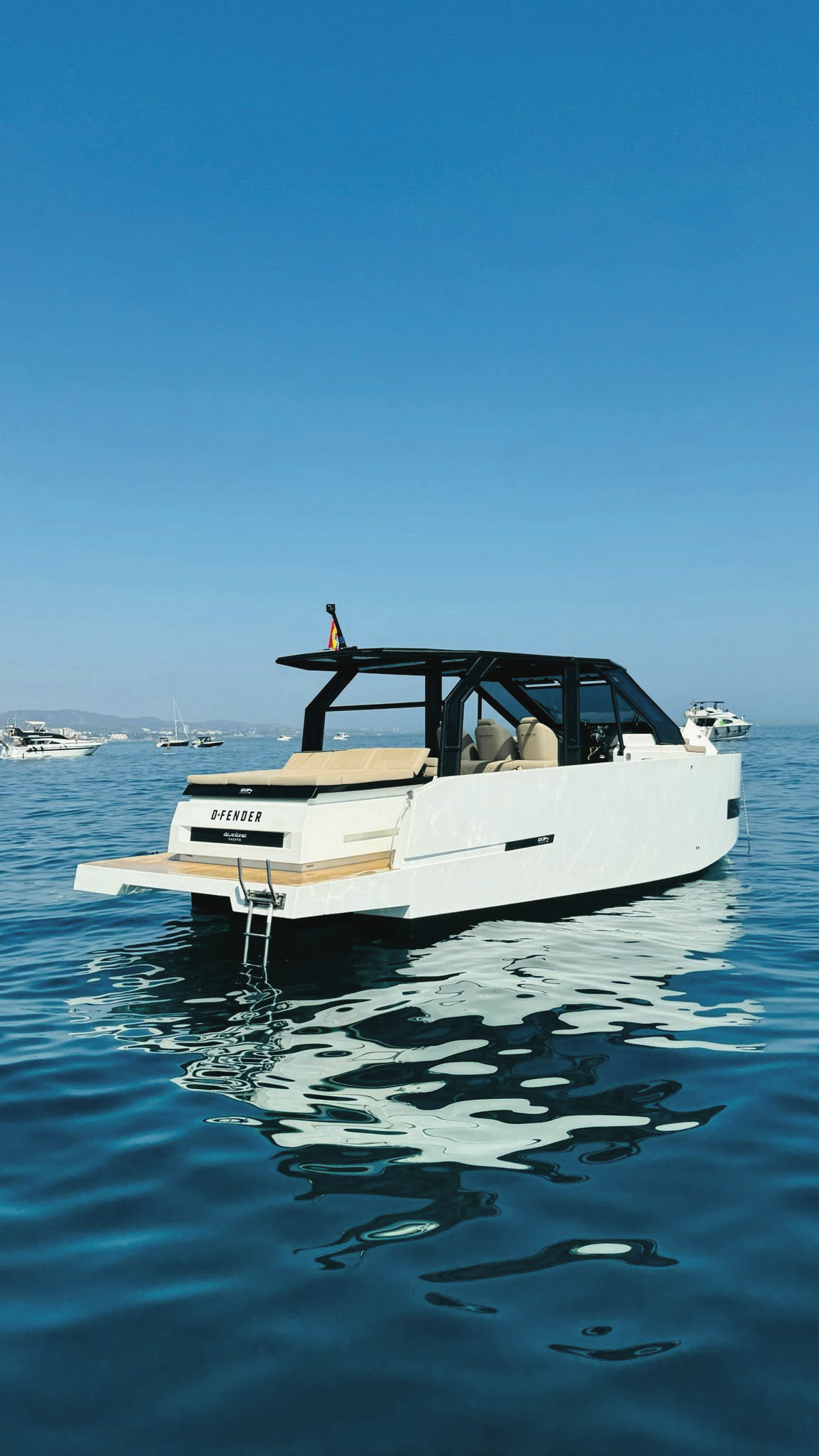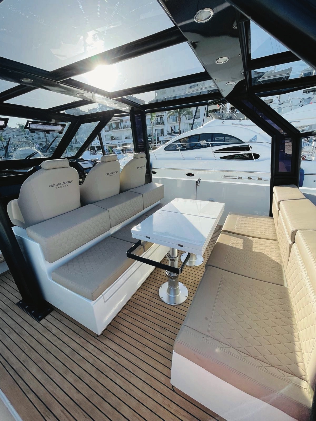 Este moderno yate del astillero De Antonio Yachts cuenta con un gran espacio para hasta 12 pasajeros, y se encuentra atracado en el puerto de Puerto Banús, en Marbella.